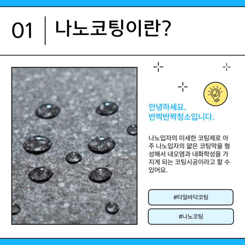 나노입자의 미세한 코팅제를 타일 위에 도포해서 타일 청소를 용이하게 해주고 타일 수명을 늘려주는 작업입니다. 코팅 작업으로 타일 위에 나노입자의 아주 얇은 코팅막을 형성해 주기 때문에 내오염과 내화학성을 높여줍니다. 대체로 타일 종류의 바닥에 시공되어지고 있습니다.